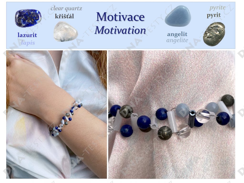 Kombinace pyritu, angelitu a lazuritu poskytuje motivaci jak v každodenním životě, tak v náročných situacích. Pyrit pomáhá překonat lenost a dodává energii pro mimořádné úspěchy. Angelit pomáhá udržet nadhled, zvyšuje sebedůvěru a poskytuje klid a mír. Lazurit zajistí stabilitu a jistotu ve chvílích nejistoty, zároveň pomáhá odstraňovat negativní vlivy. - Štěstí – zelený aventurin, malachit, citrín
